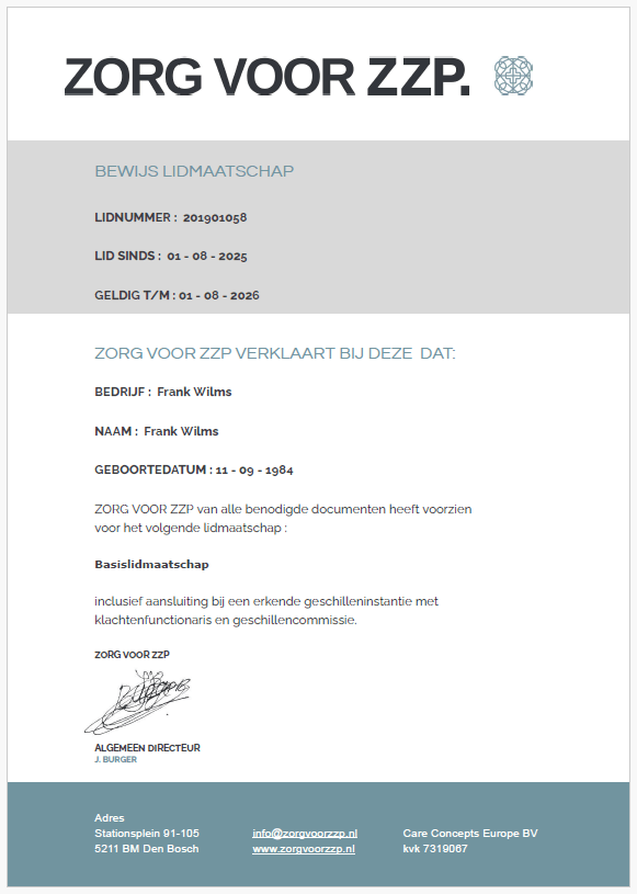 Klachten en geschillencomissie: Vanwege de Wet Kwaliteit, Klachten & Geschillen zorg (Wkkgz) en Wet toetreding zorgaanbieders (Wtza) ben ik aangesloten bij Zorg Voor ZZP. Wkkgz is een belangrijke wet die in Nederland de kwaliteit van zorg en de afhandeling van klachten regelt. Deze wet is van toepassing op alle zorgaanbieders, inclusief individuele zorgverleners, aanbieders van cosmetische zorg en alternatieve geneeswijzen. De Wkkgz stelt een aantal verplichtingen vast die ervoor moeten zorgen dat de zorg van hoge kwaliteit is en dat er goed omgegaan wordt met klachten en geschillen. Het bijbehorende certificaat vind je hieronder.